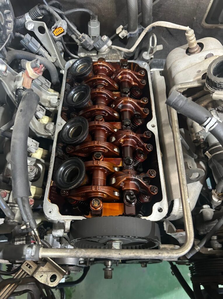 こちらはエンジン上部のカバーを外した状態になりますが長年オイル管理が行き届いていないとこのようにオイルが焼け至る所にスラッジが蓄積してしまいます( ;∀;)こうなるとエンジンオイルが減るなどの不具合が出てきてしまい最悪エンジンを載せ替える場合も出てくるので皆様半年または5000キロ毎の交換をおススメいたしますm(__)m
