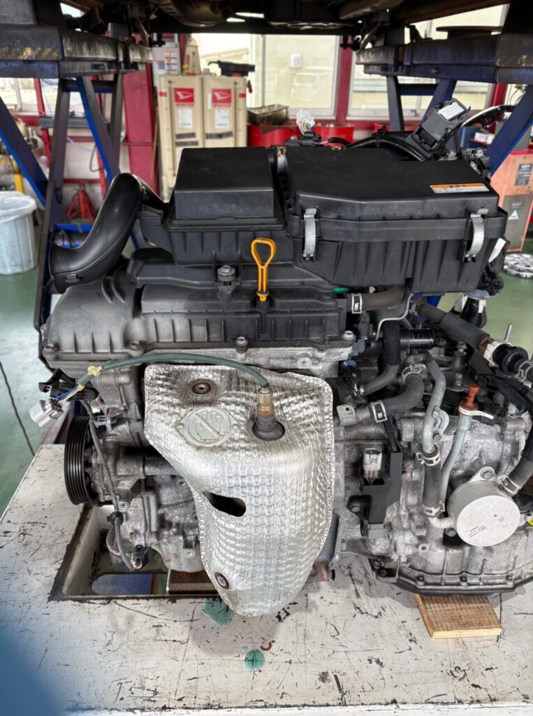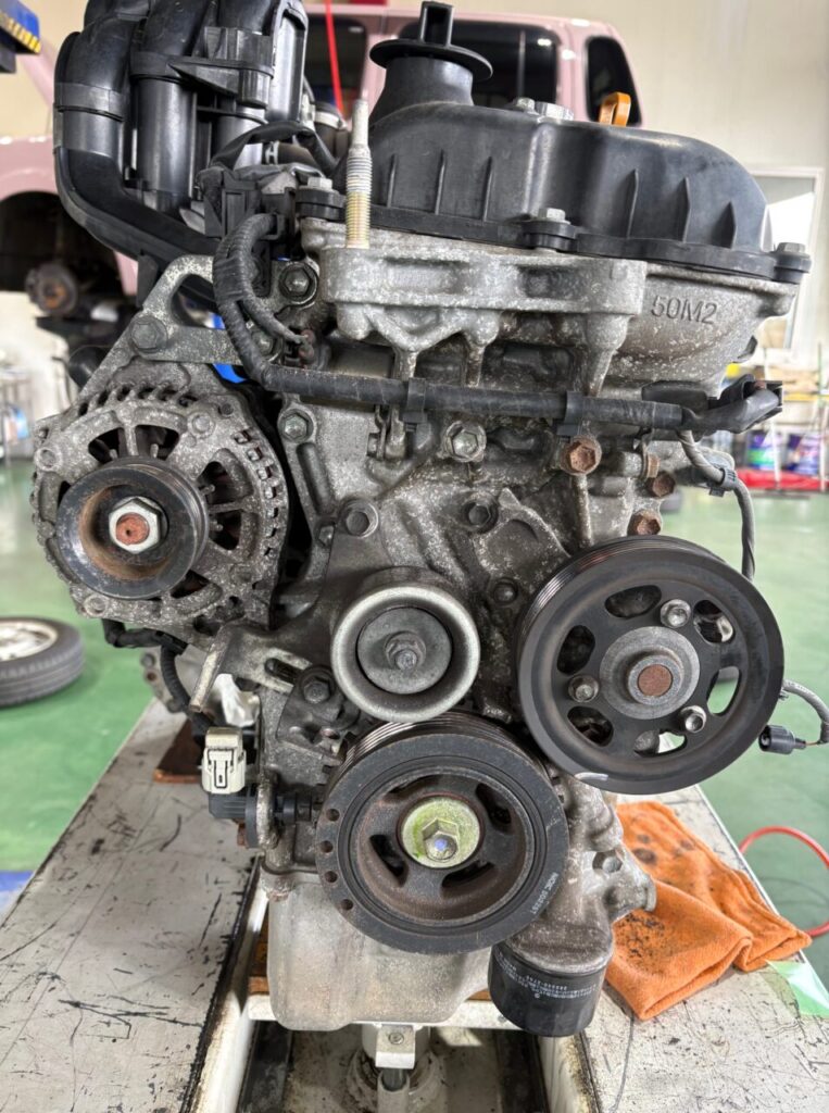 お車はスズキのハスラーでエンジンかけるとジャラジャラと異音がするとの事、、、点検するとエンジン内部のタイミングチェーンの伸びによる異音と判明しましたのでさっそく車両からエンジンを脱着してタイミングチェーンとチェーンテンショナーを交換していきます( `ー´)ノ