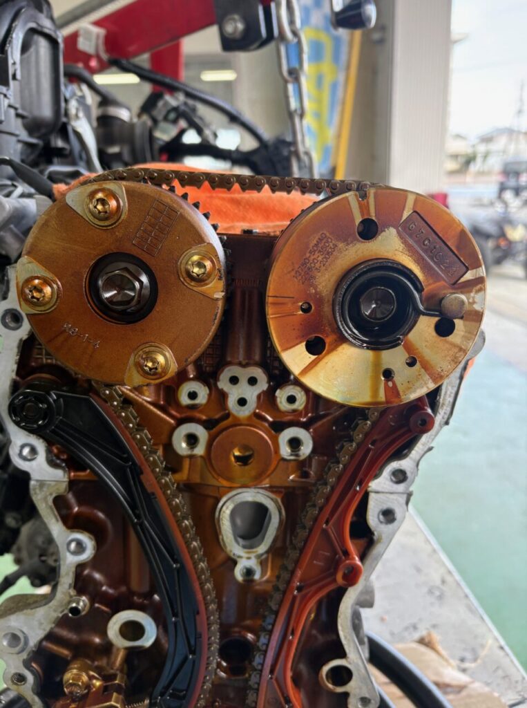 エンジン前方部を分解していくと中に問題のタイミングチェーンが鎮座しておりますのでとにかく分解を進めていくと、、、